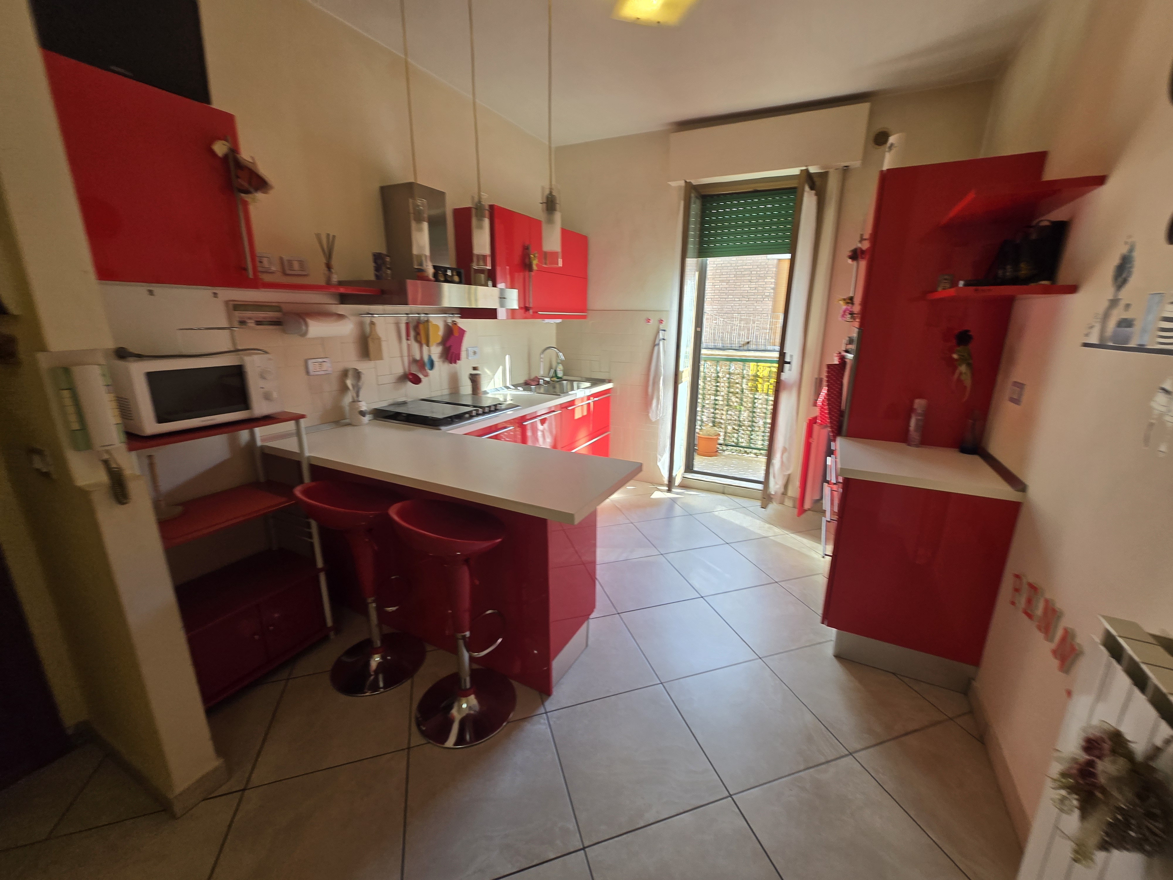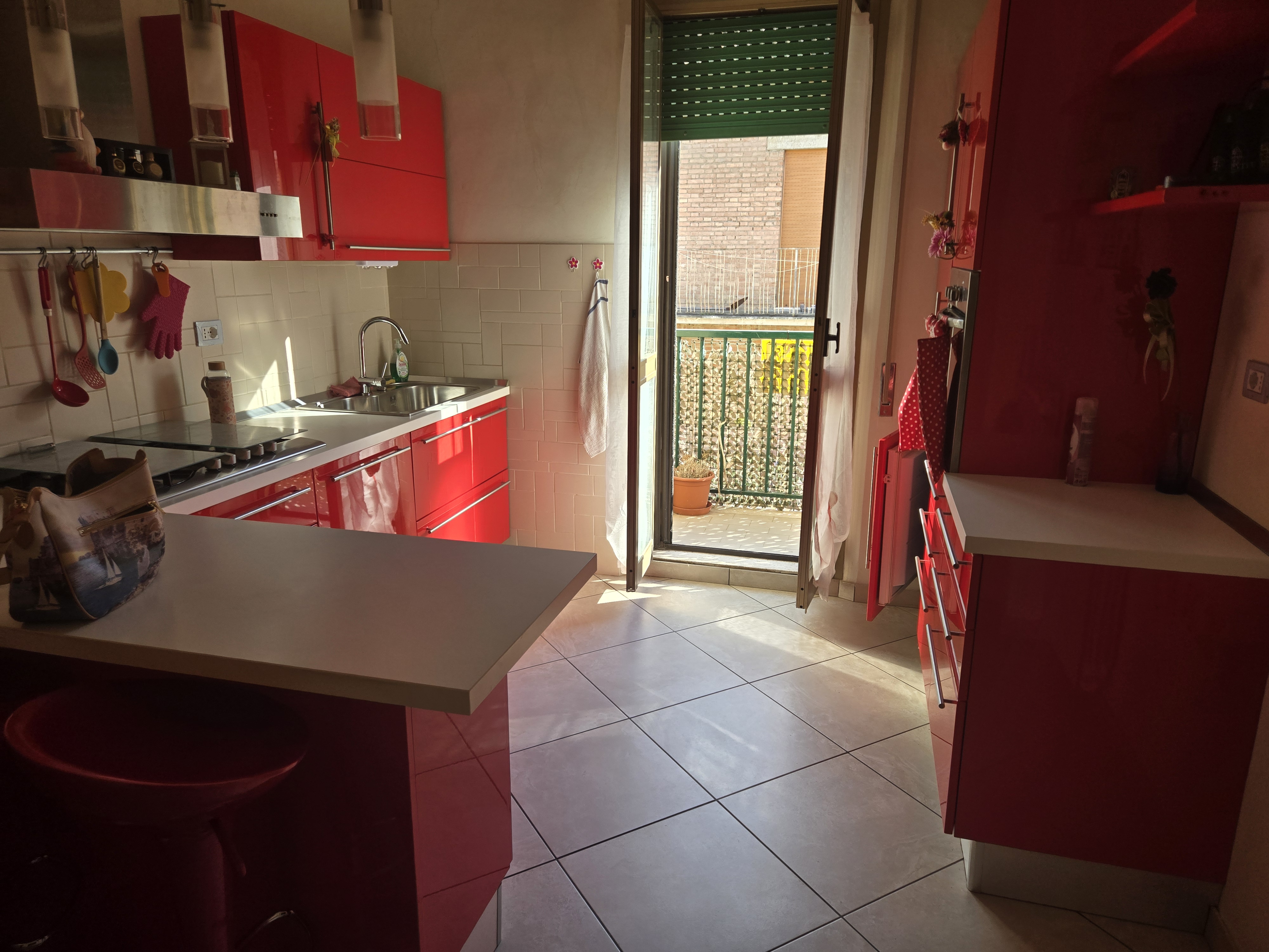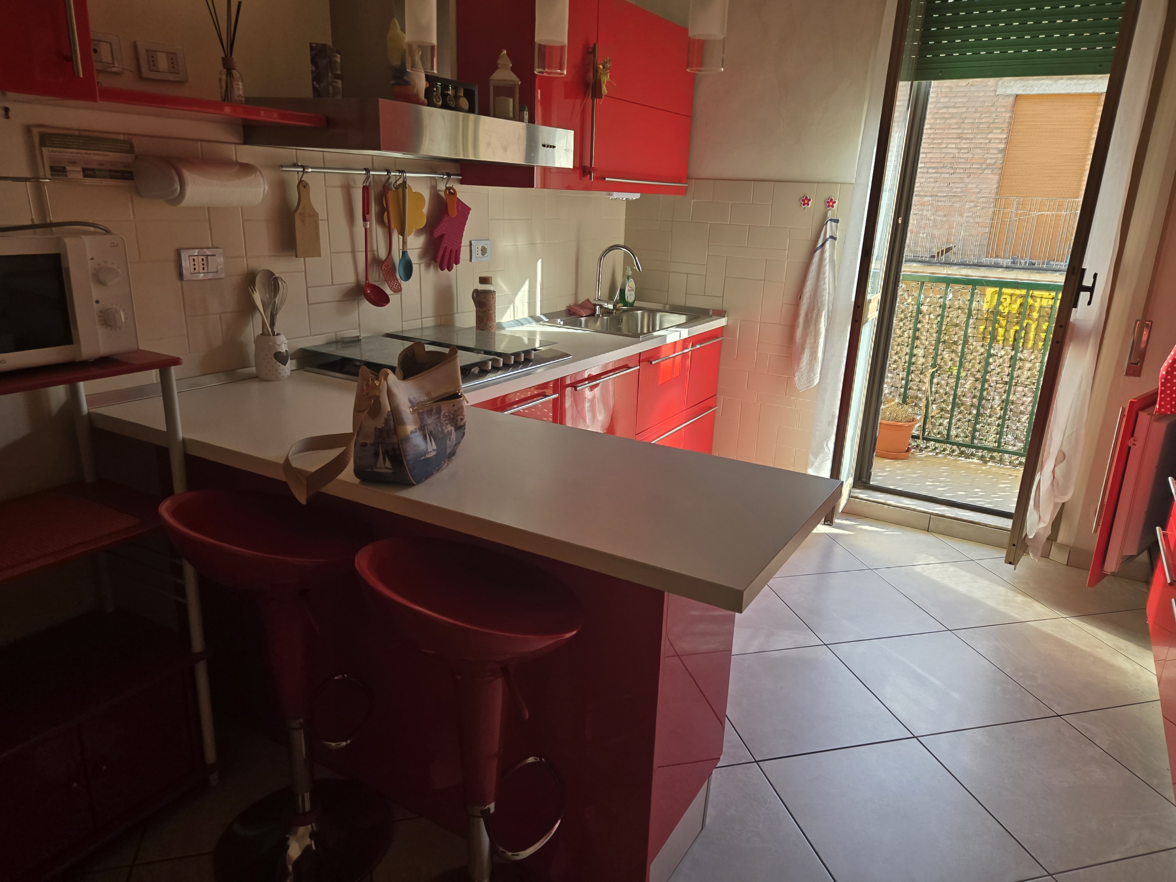 Una cucina abitabile con accesso diretto a un balcone, perfetto per godersi una colazione all’aperto.