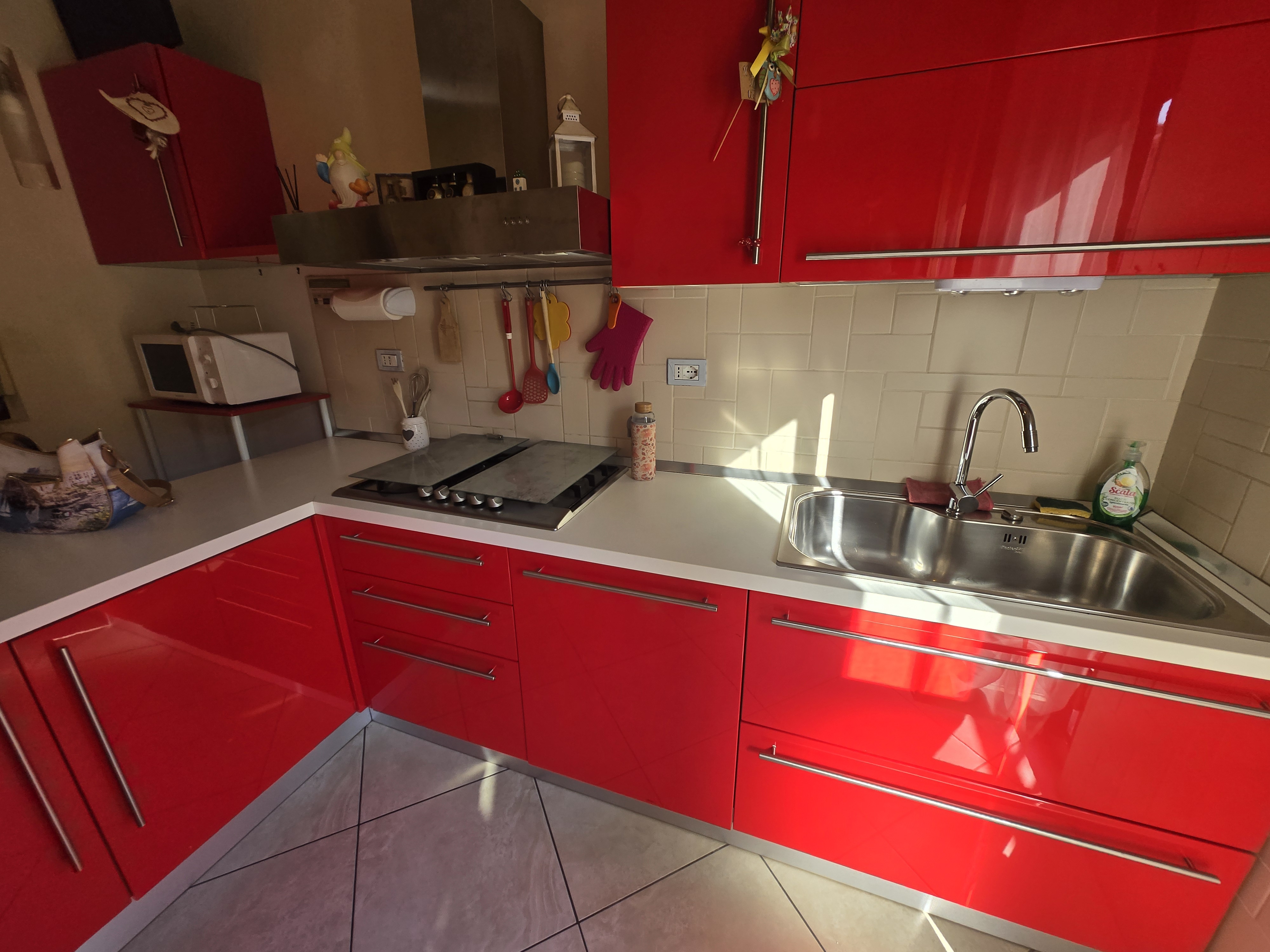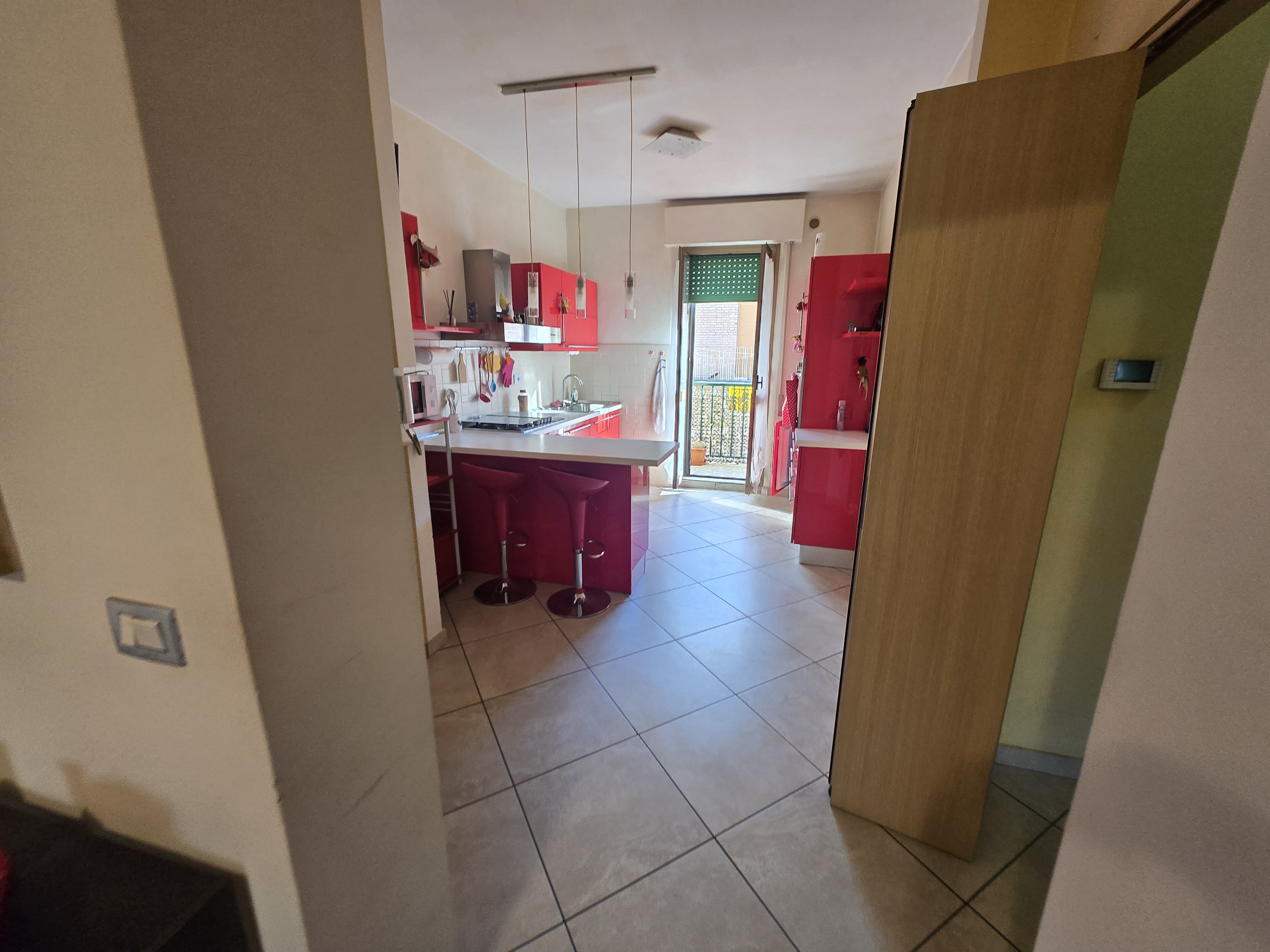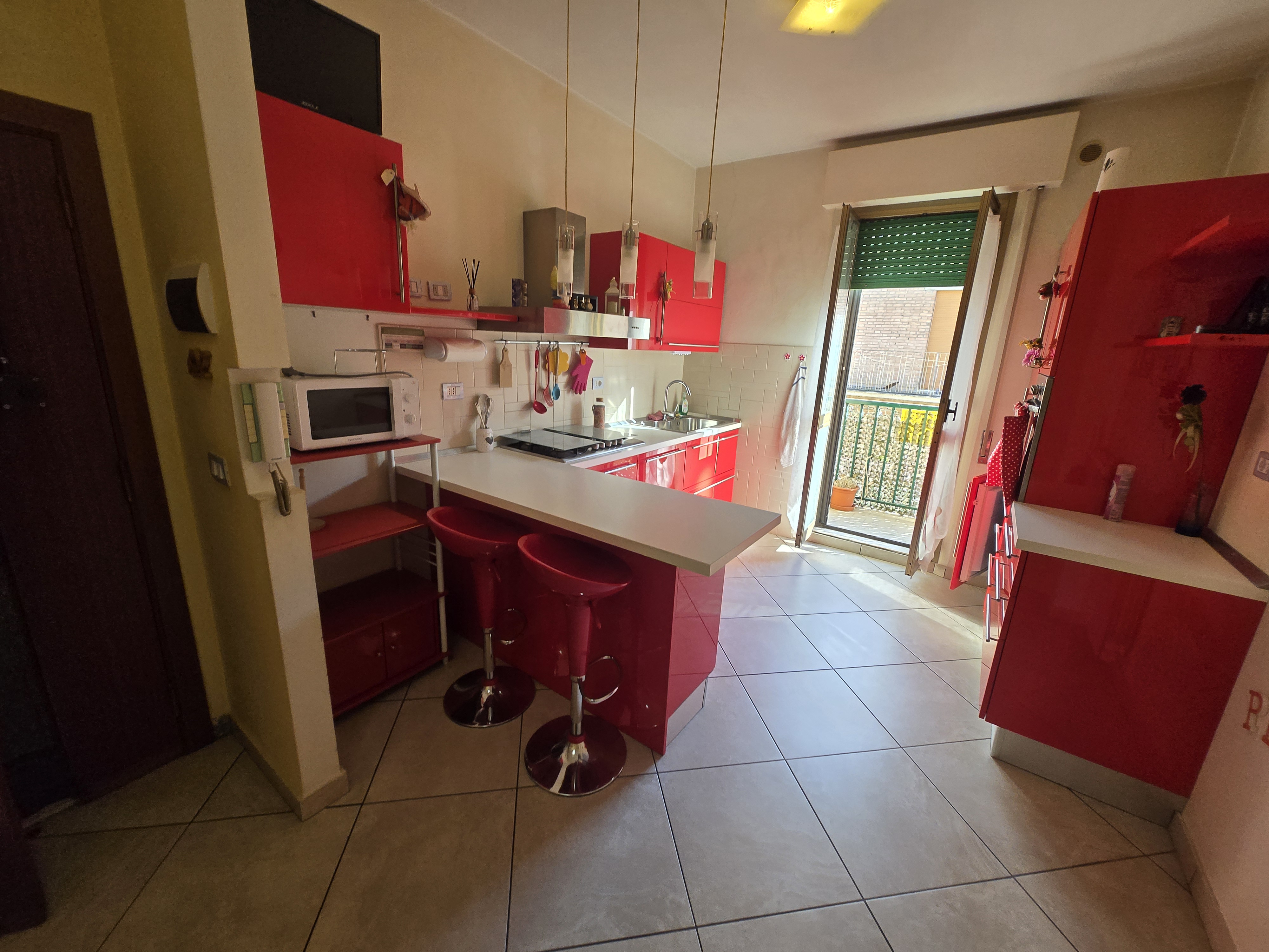 Una cucina abitabile con accesso diretto a un balcone, perfetto per godersi una colazione all’aperto.